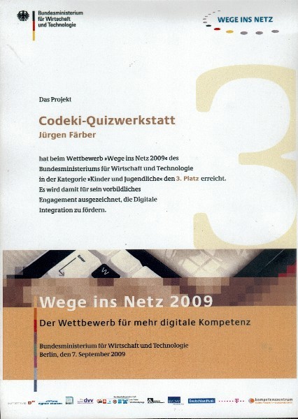 - Quizwerkstatt - Für das Konzept meines Online Portals " Quizwerkstatt" erhielt ich den 3. Preis bei "Wege ins Netz 2009" (Bundesministerium für Wirtschaft)